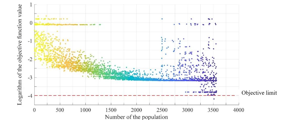 基于上述苏通桥试验精细有限元模型和模型更新程序,采用E1工况的模态识别结果开展了模型更新工作,计算过程如图7所示,其中每一种颜色代表遗传算法的一步迭代,每一个数据点为一次完整的有限元分析计算后得出的目标函数值,整个更新过程包括3565次苏通桥模型的模态分析,基于上述115核计算集群需耗时6567秒(1.82小时),相比基于单核的计算耗时(8天11小时)效率提升约为111倍,模型更新结果与基于E1工况数据的模态识别结果对比如表1所示。