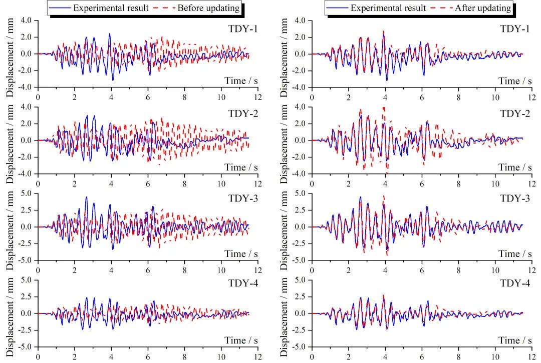 对上述更新后的模型输入E2工况地震动,进行动力时程分析,更新前后模型计算响应与试验结果对比如图8所示(仅展示北塔位移时程,传感器编号见图3,其他结果敬请访问原文),可以看到更新后模型计算精度大幅提升。