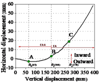 通过试验,可以得到如图3所示的PCR和ICR两个试件的承载力-位移曲线。图中,点A、B、C分别对应压拱机制的峰值载荷、压拱机制与悬链线机制的转换点、悬链线阶段的峰值载荷。