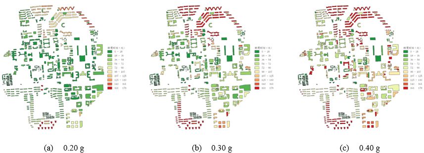 图18 不同PGA水准下清华校园建筑的名义修复时间中位值分布(加固后)