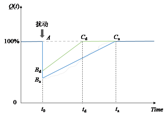 本研究将系统的韧性水平定义为预期功能恢复曲线的横坐标轴围成面积与目标功能恢复曲线的横坐标轴围成面积之比,如图2所示。