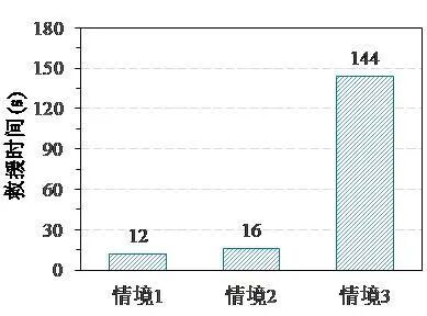 三种情境下的救援时间和综合危险系数如图6所示,由于情境2喷淋系统完好,因此救援时间和正常情境相近。而情境3由于喷淋系统破坏和次生坠物的影响,救援时间比情境2增加8倍,综合危险系数增加32倍。由对比可知,非结构构件震害对人员救援时间和危险性起到决定性影响。
