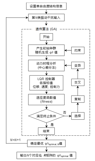 2) 对控制系统在不同类型振动下的LQR控制算法的QR系数矩阵进行优化,采用遗传算法求解每种类型振动对应的最优QR矩阵参数;
