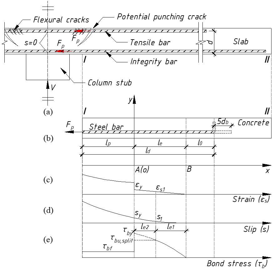在混凝土开裂后,钢筋与混凝土间会产生相对滑移,其间的粘结力可表示为滑移量的函数,这个函数关系可由钢筋拔出试验得到。模式规范(fib Model Code for Concrete Structures 2010)中所给出的基本公式基于锚固长度较短的试验,反映未屈服钢筋的平均粘结力;而在锚固长度较长的拔出试验中,钢筋屈服会对粘结力产生较大影响。在板柱子结构试验中,节点附近的钢筋很快会进入屈服阶段,因此在模型中需加入此项影响。试验时发生冲切破坏后冲切区域外的板中钢筋状态与拔出试验接近(图2),因此可根据锚固长度较长的拔出试验来进行研究。拔出试验中的钢筋可划分为三段:已进入塑性的lp,尚处于弹性的le和还未受力的l0。对于弹性段的钢筋,可对其使用模式规范中给出的粘结-滑移关系,而对于进入塑性状态的钢筋,可假设其仅有残余粘结应力。由于单调加载试验中某处钢筋进入塑性状态时刻与其滑移量是唯一对应的,因此在模型中可以根据滑移量来判断其状态并赋予相应的粘结力。经过推导,钢筋屈服时的滑移量可由式(1)计算。