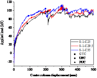 基于验证后的模型,研究了混凝土强度、板厚和受拉钢筋配筋率对结构倒塌行为的影响(图7)。可以看出前三个参数均对结构的前期受弯承载力有一定影响,但程度不同;而在冲切破坏后的拉薄膜效应阶段内,只有钢筋配筋率对承载力有较大影响。