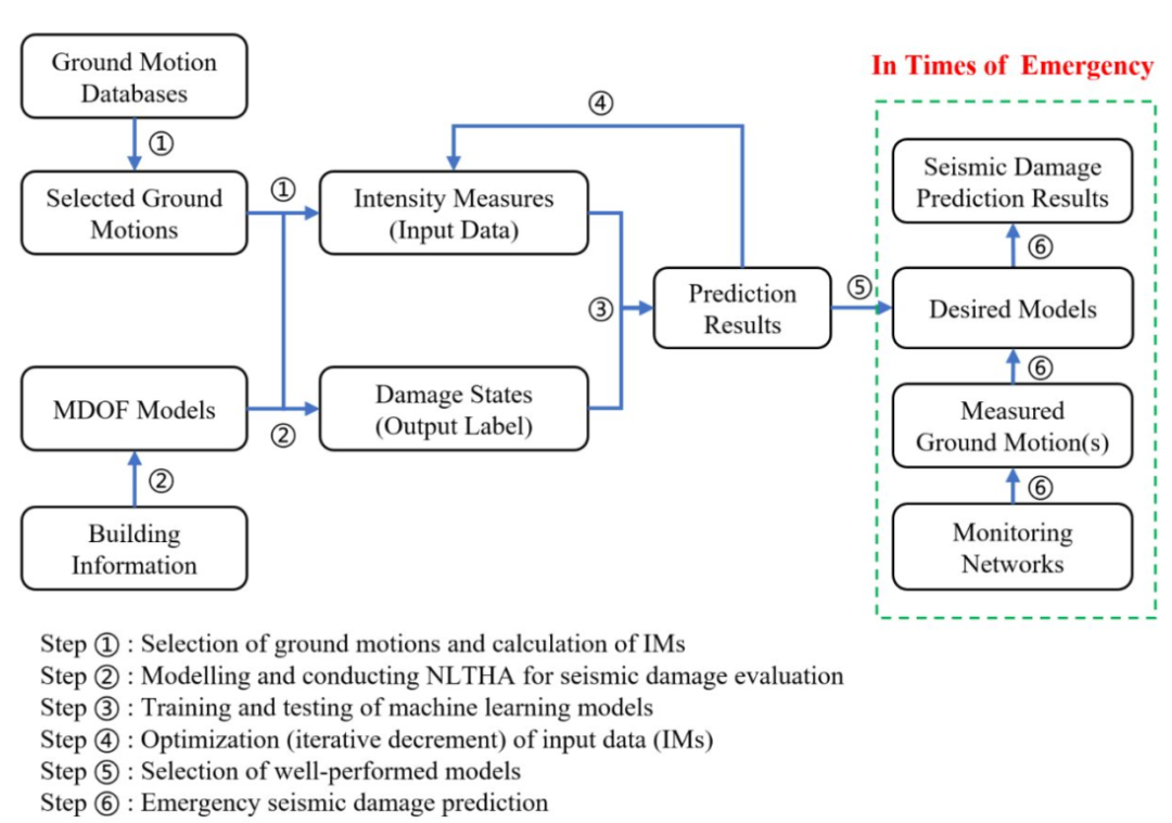 本研究提出了一种结合机器学习方法和多元地震动强度指标的震害实时速报方法,以平衡震害应急评估的“准确性”与“实时性”需求。该方法基于大量历史地震动记录,计算出多元地震动强度指标,随后开展准确的非线性时程分析方法获取破坏力结果,基于机器学习方法学习强度指标与破坏力的映射关系,保障准确性;此外,该方法通过“震前训练验证、震后应急预测”两步走,将耗时较长的训练、验证环节前置,保障实时性。