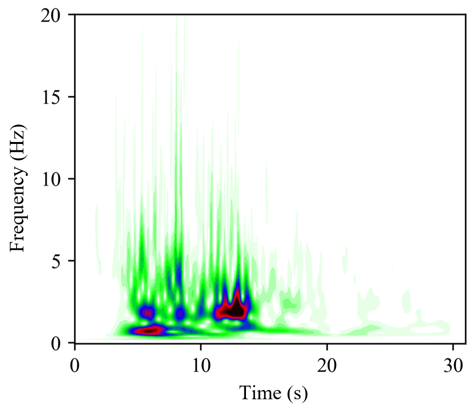 (2) 持时调整:截取PGA出现时刻前后30s的地震动峰值区段,舍弃其余区段。该步骤是为了保证所有输入CNN的小波时频图的尺寸及其语义(即图像中每个像素点所代表的时域步长与频域区段大小)的一致性。