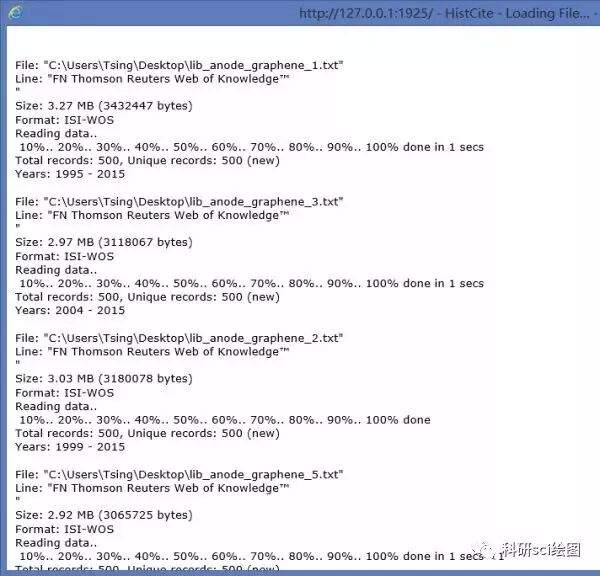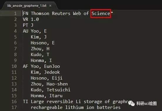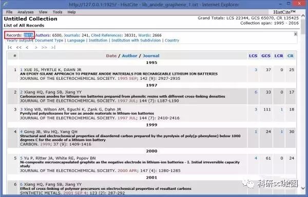 HistCite 这款软件是 Thomson Reuters (汤森路透)公司开发的,和 WOS 是一家公司,所以 HistCite 只支持 WOS 数据库,对于 Scopus 等数据库则无能为力,不过 Github 上面有人写了一个可以将 Scopus 导入 Histcite 进行分析的脚本——Scopus2Histcite,有兴趣的同学可以去试试看。2016年10月,汤森路透知识产权与科技业务被 Clarivate Analytics (科睿唯安)公司收购了,从此 WOS 也是归该公司所有,因此导出的数据纯文本也发生了些许变化,从而不能直接导入 HistCite 进行分析。不过别担心,HistCite Pro 完全兼容新的文件格式!打开WOS,注意数据库要选择核心合集(Core Collection)!1. 例如简单检索一下石墨烯在锂离子电池负极中的应用:2. 检索结果不是太多,可以全部导出,如果文献太多的话,可以先按照被引频次降序排列,只导出前2000篇就差不多了。3. 下面开始导出文献信息,点击页面上的【保存至 Endnote Online】按钮右边的下拉按钮,选择【保存为其他文件格式】。4. 在弹出的菜单中,记录数填写1到500,因为每次最多只能导出500篇文献,所以上面的2819篇文献需要分成6次导出,后面导出的时候依次填写501到1000、1001到1500等等。。。记录内容选择【全记录与引用的参考文献】,文件格式选择【纯文本】,然后点击发送即可得到导出的 txt 文件,类似可以导出其他5个。注意:含500个记录的txt文档一般是3M左右,如果你的只有几百K,请仔细按照上面这张图进行导出!!!5. 下面使用 HistCite 来分析这6个txt格式的引文数据文件。由于 HistCite 多年不更新,现在存在各种 Bug,比如直接打开 HistCite,一加载文件就报错:No such file or directory。对于这种情况,你可以选择在 C 盘根目录下新建 fakepath 文件夹,然后将全部的 txt 文档复制到里面,再打开 HistCite 来进行加载,但是仍然会遇到下面 Format Unknown 的问题。6. 尝试第二种方法。选中所有的 txt 文件,然后拖到 HistCite 的图标上,放开鼠标,果然自动打开了软件。7. 但是,事情好像并没有那么简单,又出现了一个报错:Format Unknown。8. 最后,将每个 txt 文件的第一行中的 Science 改成了 Knowledge。9. 然后再将 txt 文件拖放到 HistCite 图标上面打开,终于成功加载了!10. 可以看到2819篇文献信息全部加载进来了。11. 在受到这么多折磨之后,我用 Python 开发了一个方便使用的脚步,于是一个以 HistCite 源程序为核心的精简易用免安装版本问世了,就叫 HistCite Pro 吧。由于 HistCite 源程序只支持 Windows 系统,所以 Pro 版本也只能在 Windows 下使用!二知了精选资源: