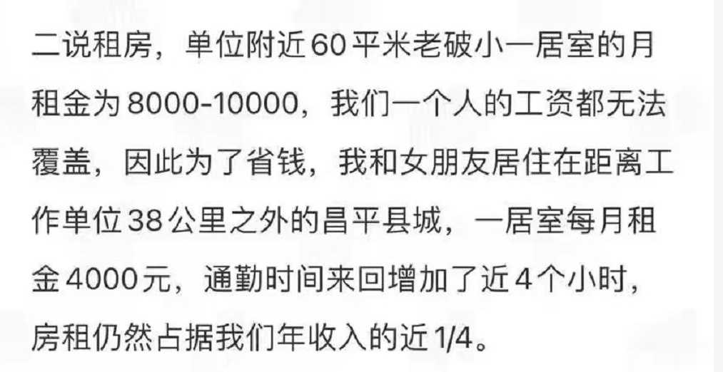 租房也很贵,在昌平租个房,只是一居室就要4000块钱,上下班来回要将近4个小时。