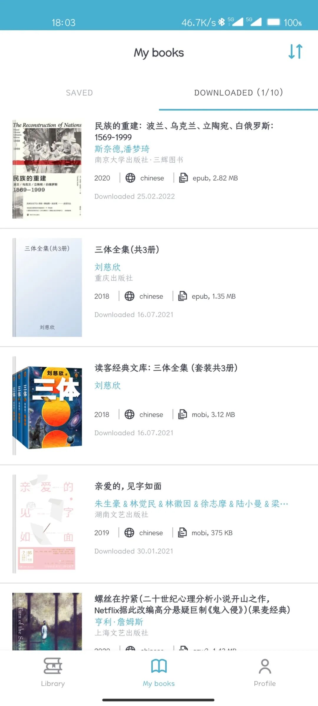 点击软件下方中间的“ My Books ”图标,就可以进入自己的书柜,你保存和下载过的书籍都会保存在这里。