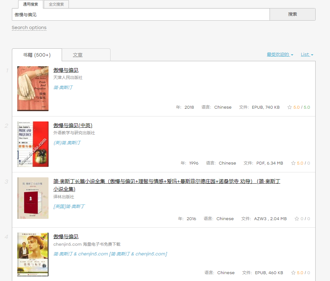 进入软件主界面,只有最上面的搜索框和书籍推荐,在搜索框内可以直接搜索要找的书籍的名字,搜索结果界面分布明了,同时标注了格式、语言、出版时间和出版社,便于寻找