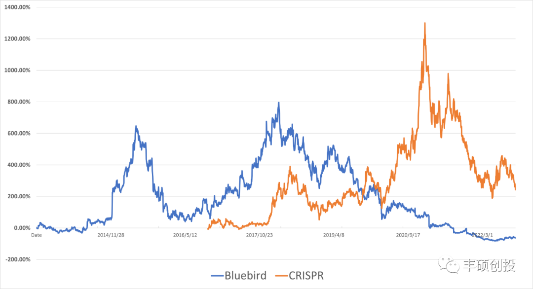 图1 蓝鸟生物、CRISPR股价涨幅(与首日开盘价相比,蓝鸟生物$16.8,CRISPR公司$15.0,丰硕创投整理)