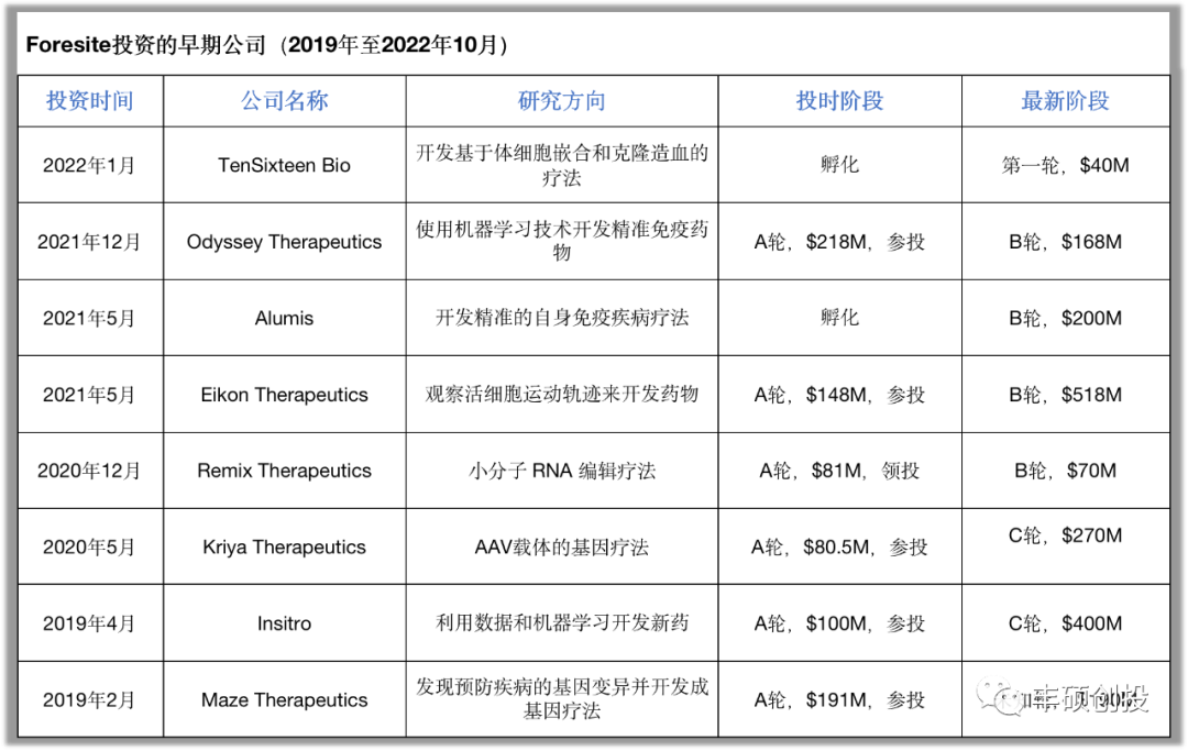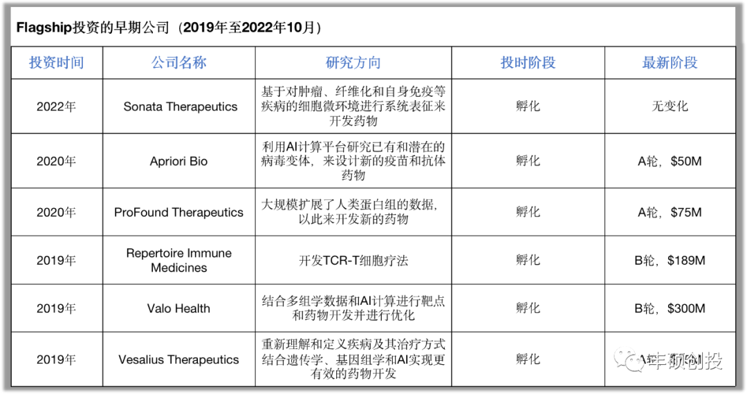 这些VC公司短则拥有十年,长则拥有四十余年的发展历史;少则拥有六七十家,多则拥有二百余家公司的投资经验,在医药研发风险投资领域成果斐然。居榜首之位的Flagship,早在2010年就开始投资孵化Moderna,到如今,仅Moderna一家公司所产生的回报,就已经远超其前前后后为百多家初创公司投入的资金总和。而且,投资人对创新技术的渴求毫不逊色于人们对临床未满足医疗手段的需求。这些VC公司均于去年和今年完成了最新一期资金的筹集,弹药充裕。对擅长孵化新技术的Flagship公司来说,它们筹集的33.7亿美元,计划在3年内的时间里创建20-25家新公司,平均下来每家初创公司将会投入超过1.3亿美元。对于项目和阶段覆盖较全面的Orbimed公司来说,它比Flagship早3个月筹集完成35亿美元的基金,预计将在北美和欧洲投约40家新公司,在中国和印度投约20家新公司,平均下来每家公司也有超过5000万美元的投入,当然,地区和阶段的不同会使得金额不同。而在今年6月份才完成募资的老牌公司Arch,在整体市场投资交易活动全面下行的背景下,募资额却逆势高涨达到29.75亿美元,比上一轮募资总额还高出10亿美元。促使这些VC公司坚定投资的动力源于人类对于生命永不停止的追求,而他们支持的生物技术又在加速刷新人们对于疾病和健康的理解。正如Arch联合创始人Robert Nelsen先生所说“生物技术的所有基础创新都在不断加速,有巨大潜力为疾病的预防、治疗、甚至治愈带来新的手段。现在的机会更多,而不是更少。”那么,这些顶级投资人都在投哪些技术,他们是如何思考的呢?我们把榜上排名前三的VC公司,它们近3年来投资的早期阶段的生物技术公司汇总在下面表格中,其中状元Flagship主攻自主孵化创新技术,榜眼Foresite兼具自主孵化+寻找发现新技术,探花Orbimed主打寻找发现新技术,正巧还颇具有代表性。图2 排名前三生科风投投资的早期阶段公司的技术领域和进展(各公司官网和公开资料,丰硕创投整理)大致看下来,相信你的脑海里就会留下一些关键词,像组学数据、AI计算/机器学习、原位/体内、细胞治疗、RNA药物等等,这些都勾勒出未来创新技术的大致轮廓,那么它们最底层的共性在哪里?如果说Genetech开启的"biotechnology"时代是把工程技术和生物学原理相结合来创造新产品的时代,那么Flagship坚定地相信下一个时代将是"digital biology"的时代,复杂的生物问题终将被转化为数字计算问题,人工智能和生物学恰恰是我们这一代人最主要的、可相互促进的创新引擎。所以,Flagship近三年推出的公司无一例外全都涉及了AI技术,Foresite和Orbimed孵化/投资的此类早期公司的比重也在增大。