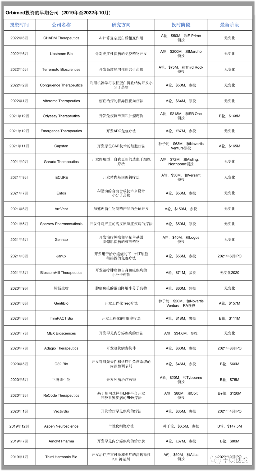 在Bay Bridge Bio公司网站上有一项统计,他们根据自有的数据库统计了在2018年到2021年8月期间从退出中获利最多的风险投资公司的排名(主要指通过纳斯达克或纽交所IPO、上市后被收购的退出途径),排除掉在多个行业间投资的VC公司后,发现专注在医药领域的生物技术投资、且排名前列的VC公司有下面表格中的这八家。图1 知名生科风投和它们最新的募资情况(各公司官网,丰硕创投整理)
