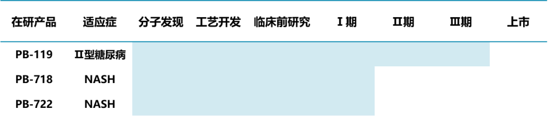 目前,公司研发管线已覆盖包括Ⅱ型糖尿病、非酒精性脂肪肝病、肥胖、高尿酸血症及痛风、阿尔兹海默症、阿片类药物引起的便秘及先天性高胰岛素血症等多个疾病治疗领域。多肽管线方面,主要包括PB-119、PB-718和PB-722等候选产品。其中,PB-119处于治疗Ⅱ型糖尿病的Ⅲ期临床;PB-718和PB-722处于治疗NASH的Ⅰ期临床。