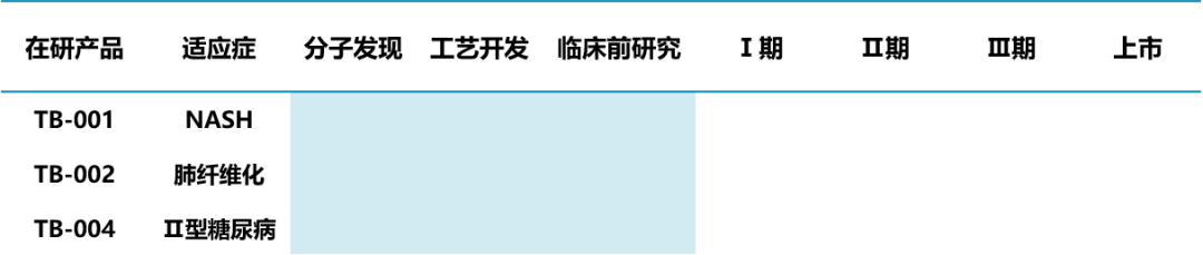 公司产品管线丰富,涵盖非酒精性脂肪肝炎及其相关纤维化,原发性胆汁性胆管炎及其相关纤维化,肺纤维化和肾纤维化等。TB-001、TB-002和TB-004是主要的多肽候选药物,均处于临床前研究阶段,分别用于治疗NASH、肺纤维化和Ⅱ型糖尿病。