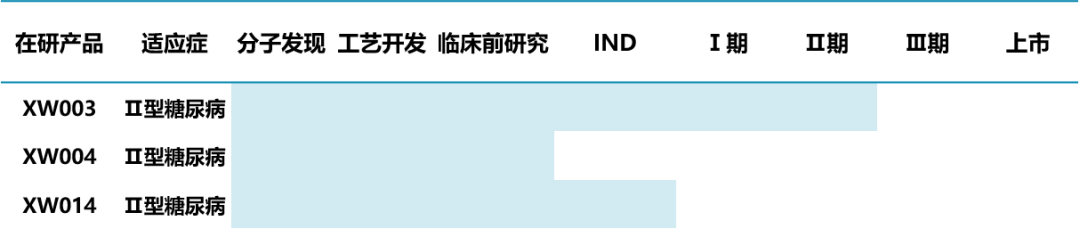 目前,先为达的多肽管线主要针对Ⅱ型糖尿病,包括XW003、XW004和XW014。其中,XW003为进展最快的多肽候选药物,处于Ⅱ期临床阶段;XW004和XW014则分别处于临床前研究和IND申请阶段。