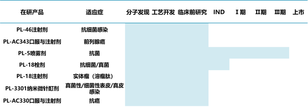 目前,公司拥有多个在研抗菌肽系列产品,包括PL-46注射剂、PL-5喷雾剂、PL-18栓剂、PL-3301纳米微针酊剂等,其中,抗菌肽PL-5喷雾剂入选国家“重大新药创制”科技重大专项“十二五”项目;成为中国首个进入人体临床试验的抗菌肽创新药;此外,还和抗菌肽PL-18栓剂项目入选国家“重大新药创制”科技重大专项“十三五”项目和荣获江苏省“双创诺奖团队”。