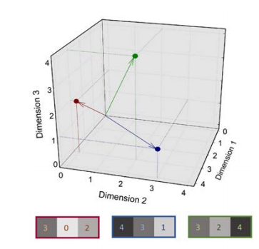 图8. 单颗粒分析中分子空间朝向的向量化表达。向量的每一维代表分子图像所具有的该像素强度,每一个三维向量分别代表一个不同朝向的颗粒。