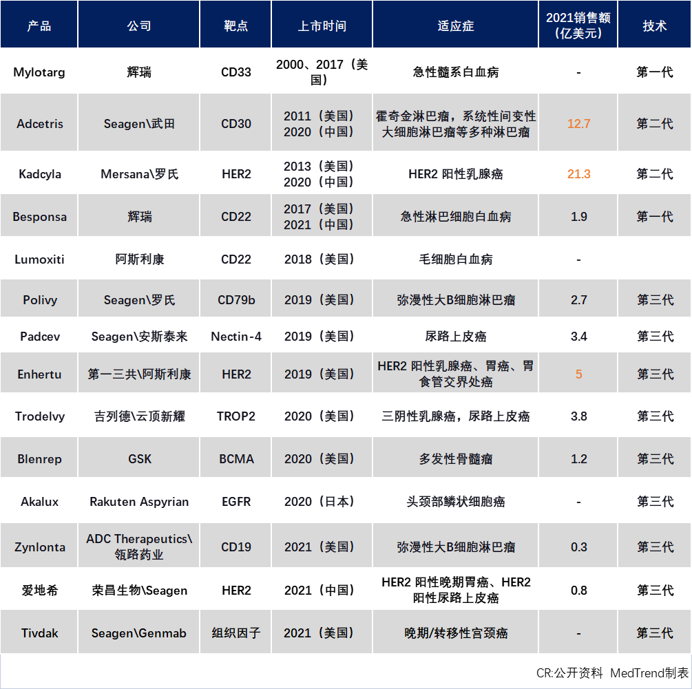 2008年,第一三共授权引进了Seagen ADC技术平台,几年后因没有成功商业化产品,双方宣布合作结束;而此后,第一三共独自继续研发ADC药物。2019年,第一三共推出了Enhertu等重磅产品。Seagen认为其产品"连接子"源自于此前授权技术的改进,侵犯了其专利(US10808039B),将其告上法庭。2022年8月,法院判决被告第一三共胜诉。Seagen当日股价即下跌5%,或许还将影响其与默沙东潜在的400亿美元并购交易。在ADC领域,Seagen是技术领军企业,拥有超过100项专利族,且专利类型覆盖化合物、序列、医药用途和组合物等非常全面;主要涵盖的靶点信息包括:CD40、CD70、CD30、HER2、CD33等,主要在肿瘤治疗领域。此外,从已获批的14款ADC上市药物来看,超过30%是与Seagen合作开发的。