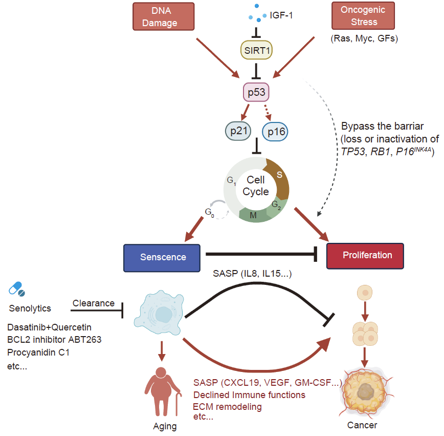 图9. p53介导的细胞衰老对于肿瘤和个体衰老的调控作用