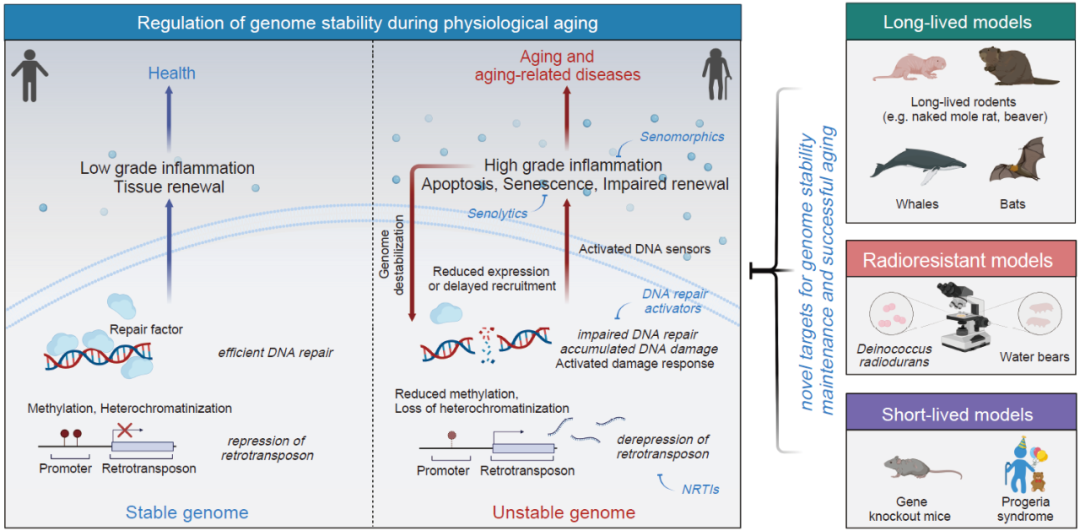 该综述第一部分 “The mechanism of aging” 从干细胞衰老、细胞衰老和细胞衰老相关分泌表型、线粒体衰老、代谢、内质网压力、表观遗传、端粒、衰老相关的基因组不稳定性、干细胞衰老和癌症等多个角度,对近年来细胞衰老及其分子机制的重要发现进行了系统的总结(图1-9),绘制了细胞衰老机制的全景图。通过对衰老的不同层面机制的解析,为衰老的延缓和衰老相关疾病的干预提供了潜在靶标。