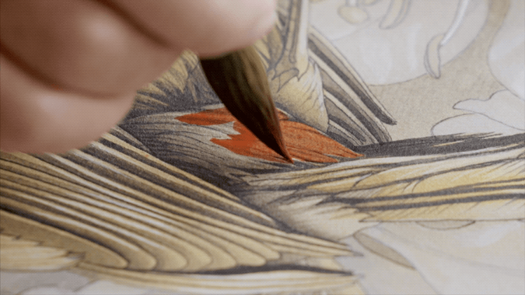 为了我们一来,就能拍到一些色彩,在我们的摄影机打开前,他已经完全进入了自然的世界,头戴着放大镜,坐在窗前,以毛笔透澈的笔画,一遍遍地叠加。