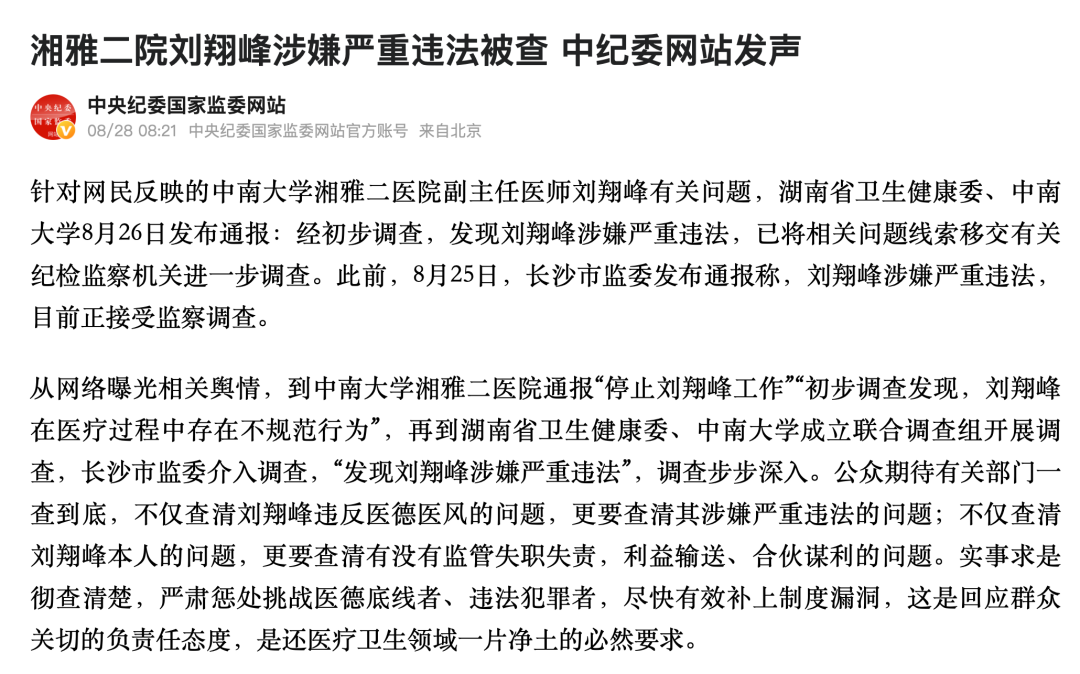 “经初步调查,发现刘翔峰涉嫌严重违法。湖南省卫生健康委、中南大学已将相关问题线索移交有关纪检监察部门进一步调查。目前,刘翔峰正接受长沙市监察委员会监察调查。”