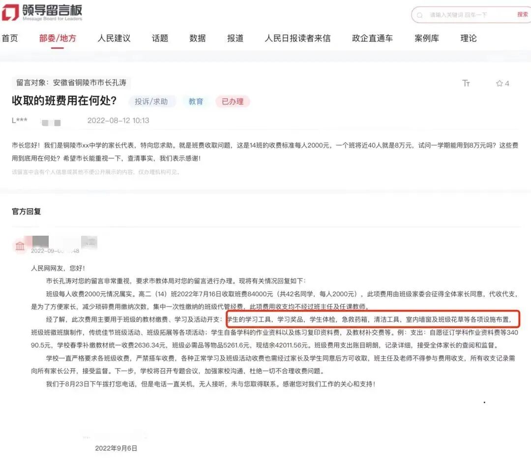 安徽某中学家长质疑高二孩子班里收取共8万元班费的合理性。