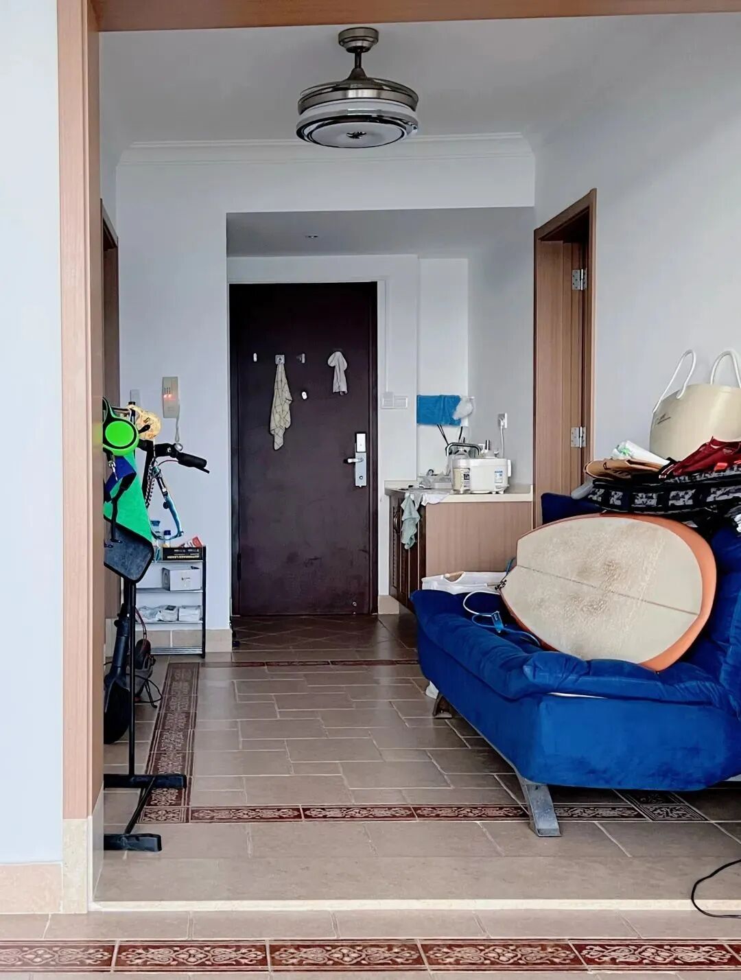 秉承着物尽其用,我们将原本摆放在客厅的旧沙发搬到了走道,用来放置各种冲浪板,将沙发挪到了躺下就能看到海湾景色的方向。
