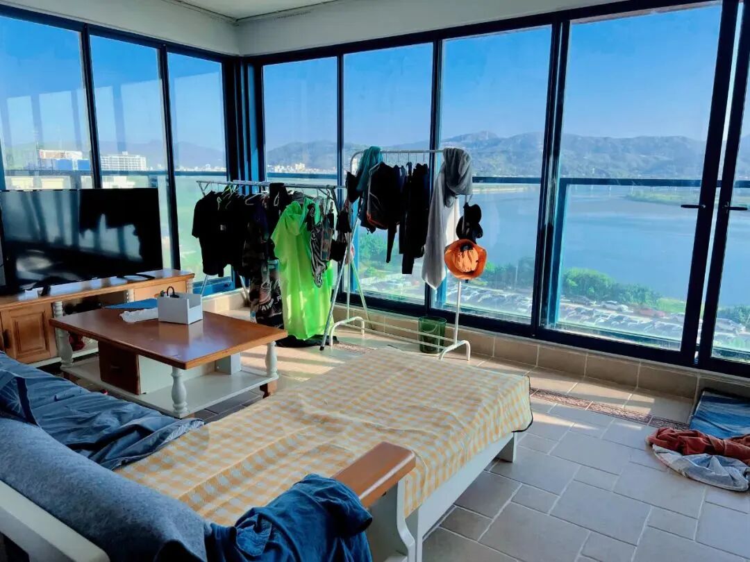 后来因为冲浪,认识了我的朋友富贵妈。我们发现在惠州不仅有150元一天任玩的冲浪机,还有很多海冲浪点,就盘算着,在那里租一间房子,毕竟旺季一晚房费也要400块,租一套房,只要来这里多住几个晚上,就算回本了。那时我们是真没想到,房租甚至没有一晚的房费贵。