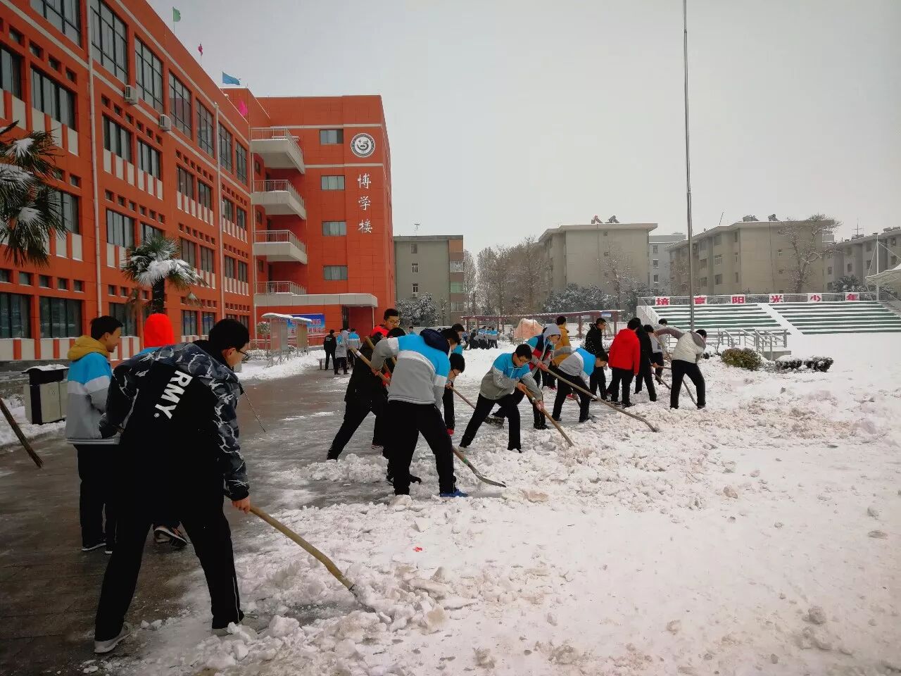 窗外的雪停了,她三步并做两步,走进教室安排了一下,就带领全班学投入到清扫校园积雪的劳动中。