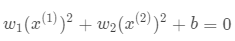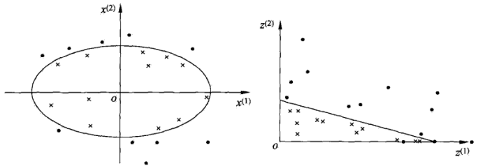 在左图,我们可以看见两类样本,其中圆点代表正样本,叉叉代表负样本。我们根本无法通过一条直线将两类样本分割开来,可以通过一个椭圆才能将两类样本分隔开,也就是说这个原始数据集是线性不可分的。