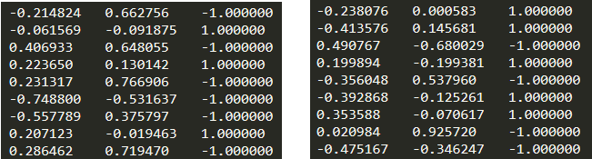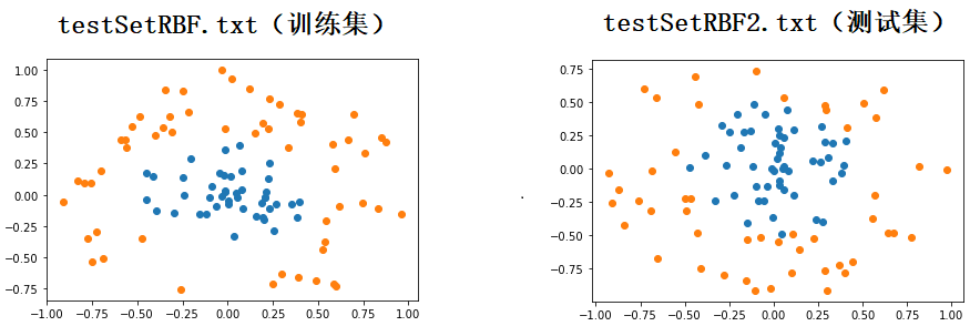 接下来我们通过实际的例子来实现非线性问题的分类吧。训练数据集采用的是testSetRBF.txt,测试数据集采用的是testSetRBF2.txt,两个数据集都有100行,三列,其中第一、第二列表示的是数据样本的属性特征,而第三列代表的是数据样本标签。数据下载地址: