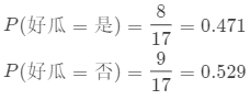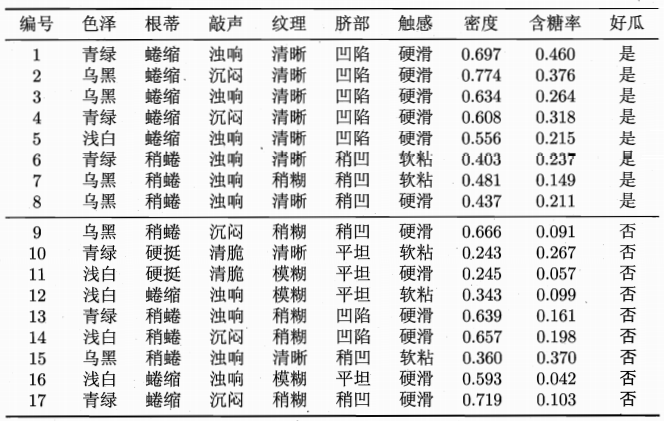 这个数据样本集总共有17个西瓜,其中好瓜有8个,坏瓜有9个。
