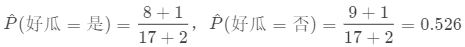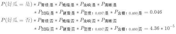 print("分类为好瓜和坏瓜的可能性分别为:", p_good_melon, p_bad_melon)