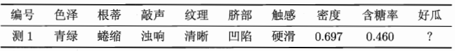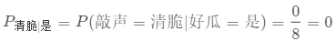 就是说,若某个属性值在训练集中没有与某个类同时出现,则我们根据前面所提到的朴素贝叶斯进行判别将会出现问题。例如,在使用西瓜数据集训练朴素贝叶斯的时候,对一个“敲声=清脆”的测试样例,有: