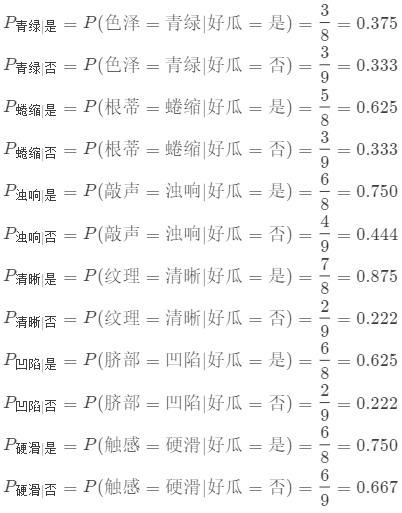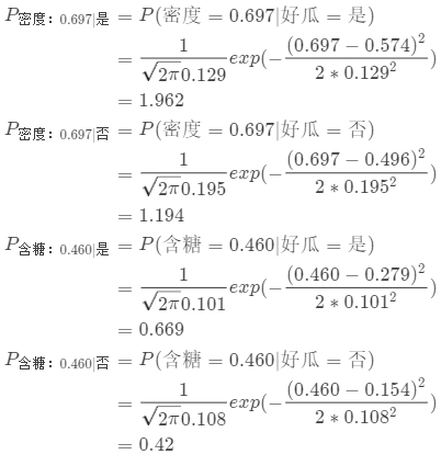 print("数值型数据的P_{(x_i,c)}:", pxi_density_0, pxi_density_1, pxi_sugar_0, pxi_sugar_1)