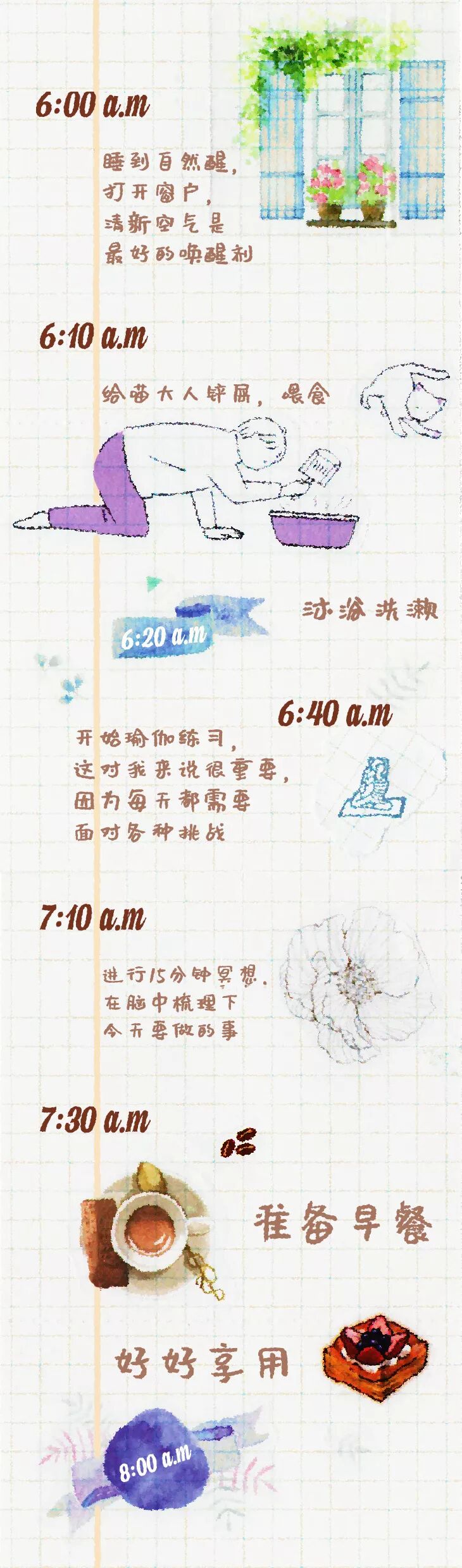 我们请设计师按照小早的作息画了一幅她每天早上的日程表: