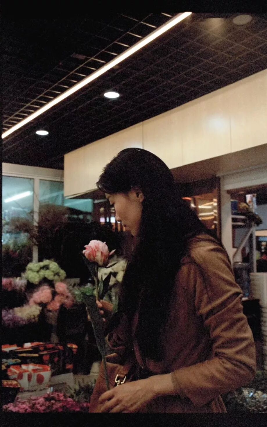 我们途径厅内空荡的古玩店铺,下行至负一层,穿过最外围的零售层继续往内,最终抵达批发市场的核心地带。每家花铺内挤搡着数个框桶,店员们并未热络地绕在顾客身旁,大家就这么隔着成簇捆码的花束谈好价钱,扫码走人。