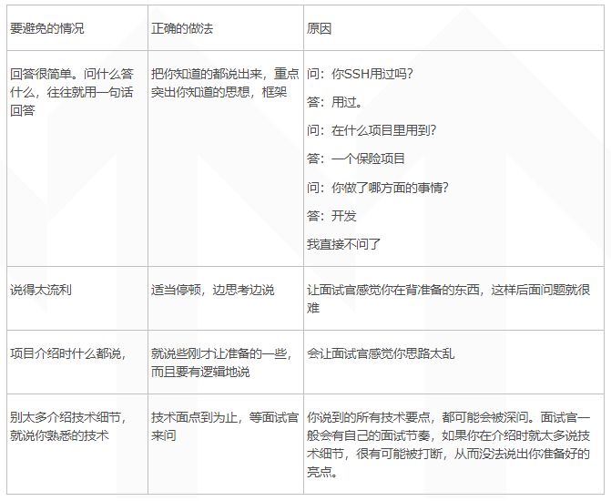 不少人是拘泥于“项目里做了什么业务,以及代码实现的细节”,这就相当于把后继提问权直接交给面试官。下表列出了一些不好的回答方式。