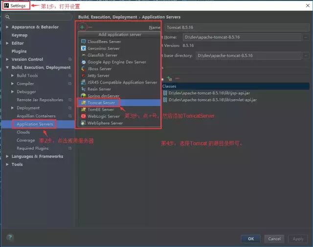 配置Tomcat方法:File -> Settings -> Deployment -> Application Servers -> Tomcat Server