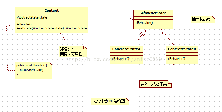 this.state = new ConcreteStateA(this);2> 在具体的子类状态类中根据构造进来的context对象,通过调用context对象的属性值进行业务逻辑判断 进行状态的检查和切换。