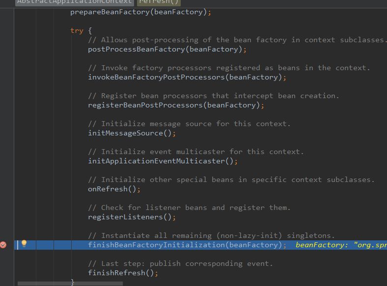 6.接下来的refreshContext(context)方法(初始化方法如下)将是实现spring-boot-starter-*(mybatis、redis等)自动化配置的关键,包括spring.factories的加载,bean的实例化等核心工作。
