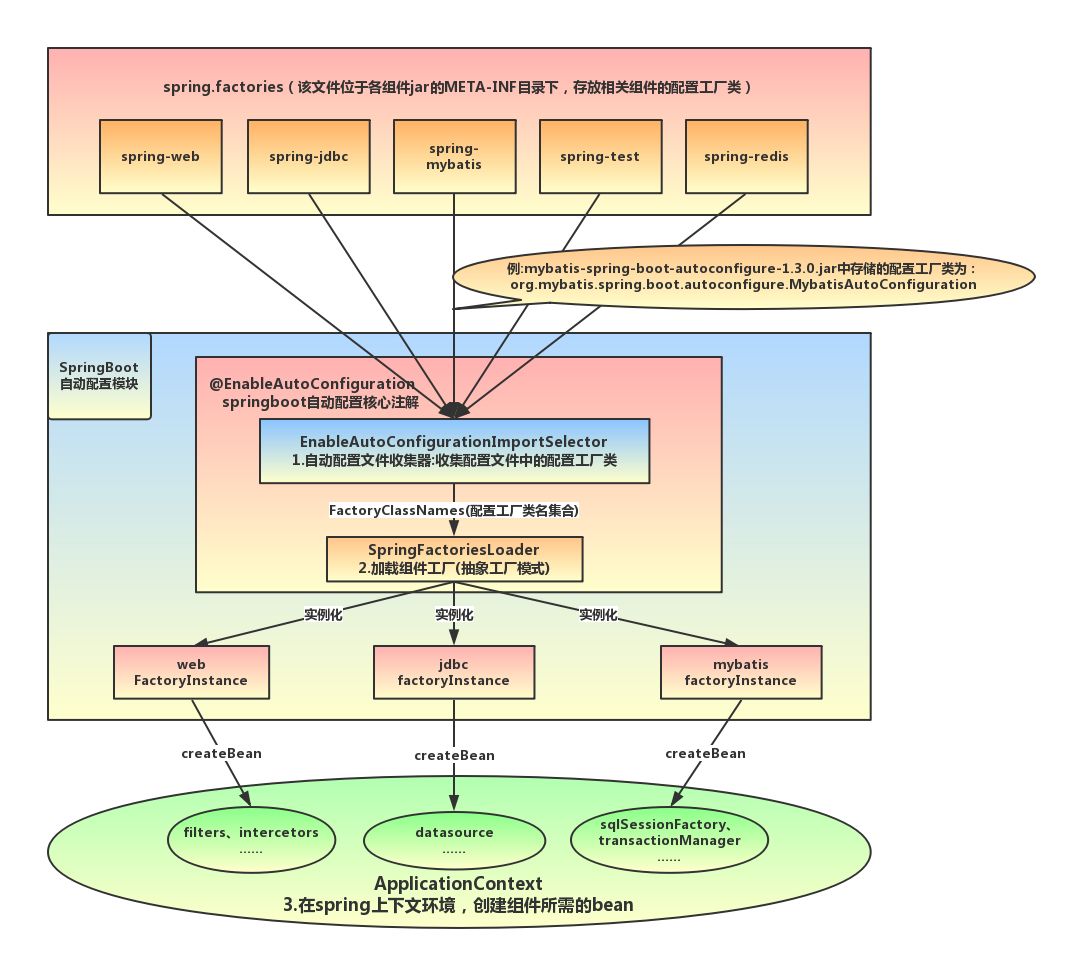 mybatis-spring-boot-starter、spring-boot-starter-web等组件的META-INF文件下均含有spring.factories文件,自动配置模块中,SpringFactoriesLoader收集到文件中的类全名并返回一个类全名的数组,返回的类全名通过反射被实例化,就形成了具体的工厂实例,工厂实例来生成组件具体需要的bean。