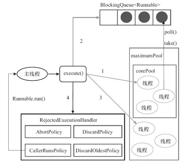 1)corePoolSize(线程池的基本大小):当提交一个任务到线程池时,如果当前poolSize<corePoolSize时,线程池会创建一个线程来执行任务,即使其他空闲的基本线程能够执行新任务也会创建线程,等到需要执行的任务数大于线程池基本大小时就不再创建。如果调用了线程池的prestartAllCoreThreads()方法,线程池会提前创建并启动所有基本线程。