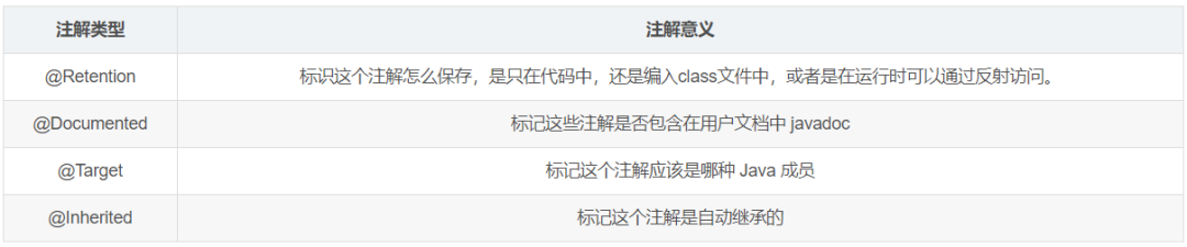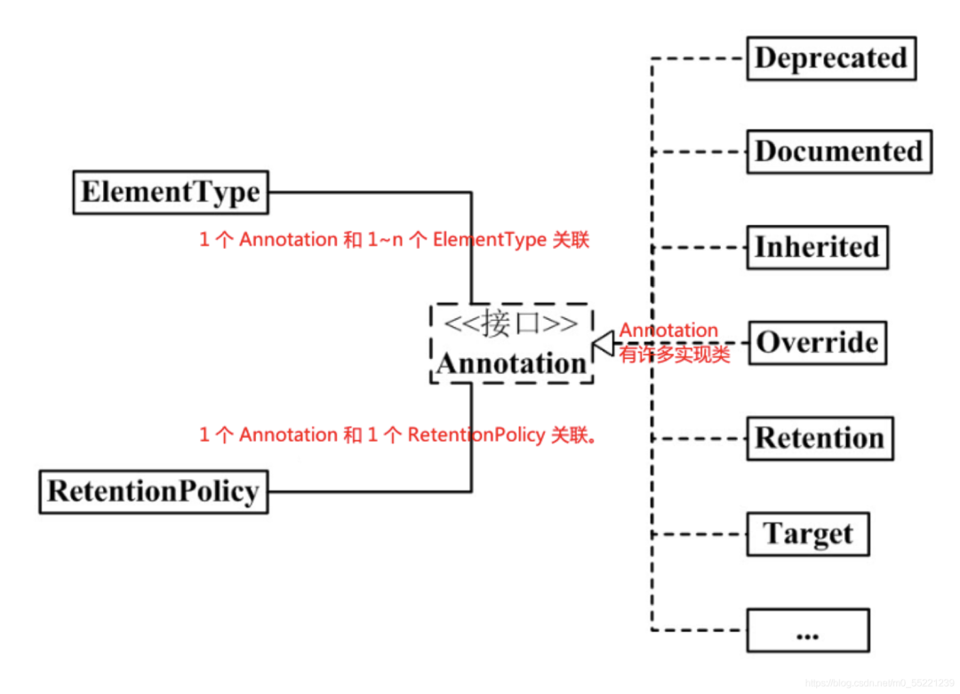 “每 1 个 Annotation” 都与 “1~n 个 ElementType” 关联。当 Annotation 与某个 ElementType 关联 时,就意味着: Annotation有了某种用途。例如,若一个 Annotation 对象是 METHOD 类型,则该 Annotation 只能用来修饰方法。