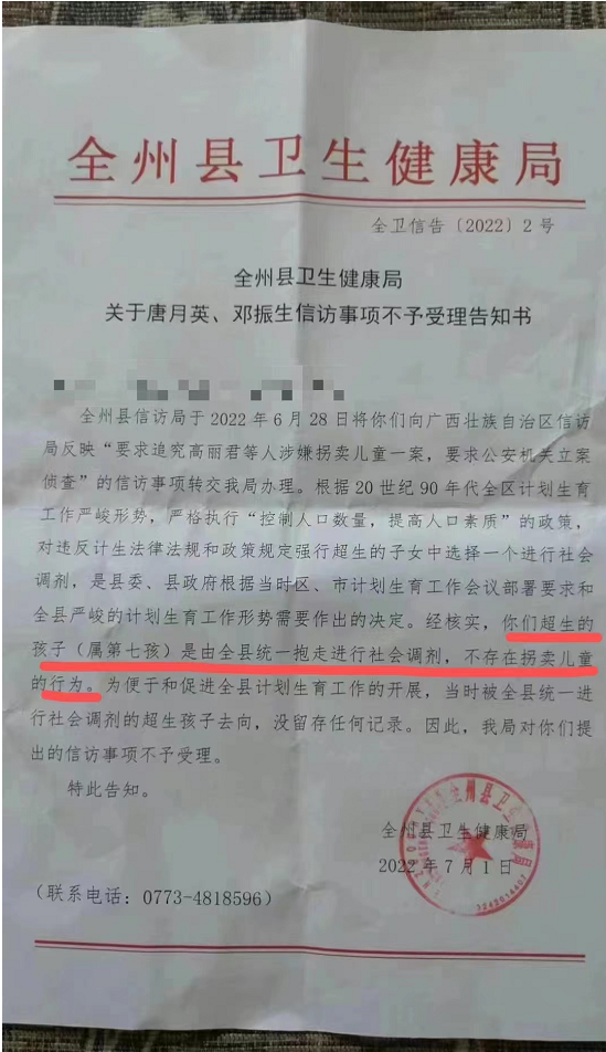 告知书中提到:根据20世纪90年代全区计划生育工作严峻形势,严格执行“控制人口数量,提高人口素质”的政策,对违反计生法律法规和政策规定强行超生的子女中选择一个进行社会调剂,是县委、县政府根据当时区、市计划生育工作会议部署要求和全县严峻的计划生育工作形势需要作出的决定。经核实,你们超生的孩子(属第七孩)是由全县统一抱走进行社会调剂,不存在拐卖儿童的行为。为便于和促进全县计划生育工作的开展,当时被全县统一进行社会调剂的超生孩子去向,没留存任何记录。因此,我局对你们提出的信访事项不予受理。