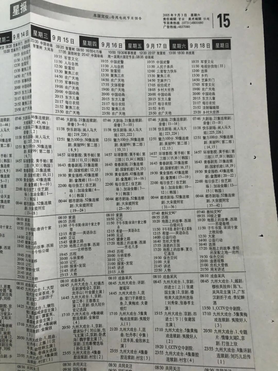 确定2005年9月17日中央电视台播放电视剧《黄手帕》时间的电视报。
