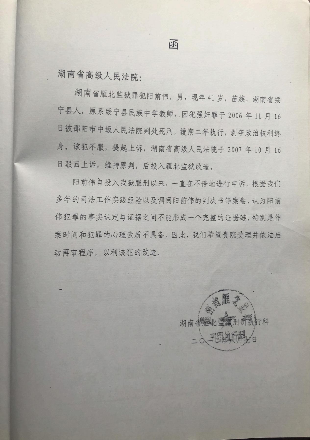 2010年6月7日,雁北监狱刑罚执行科向湖南高院致函称,“阳前伟自投入我狱服刑以来,一直在不停地进行申诉,根据我们多年的司法工作实践经验以及调阅阳前伟的判决书等案卷,认为阳前伟犯罪的事实认定与证据之间不能形成一个完整的证据链,特别是作案时间和犯罪的心理素质不具备,因此,我们希望贵院受理并依法启动再审程序,以利该犯的改造。”![]()